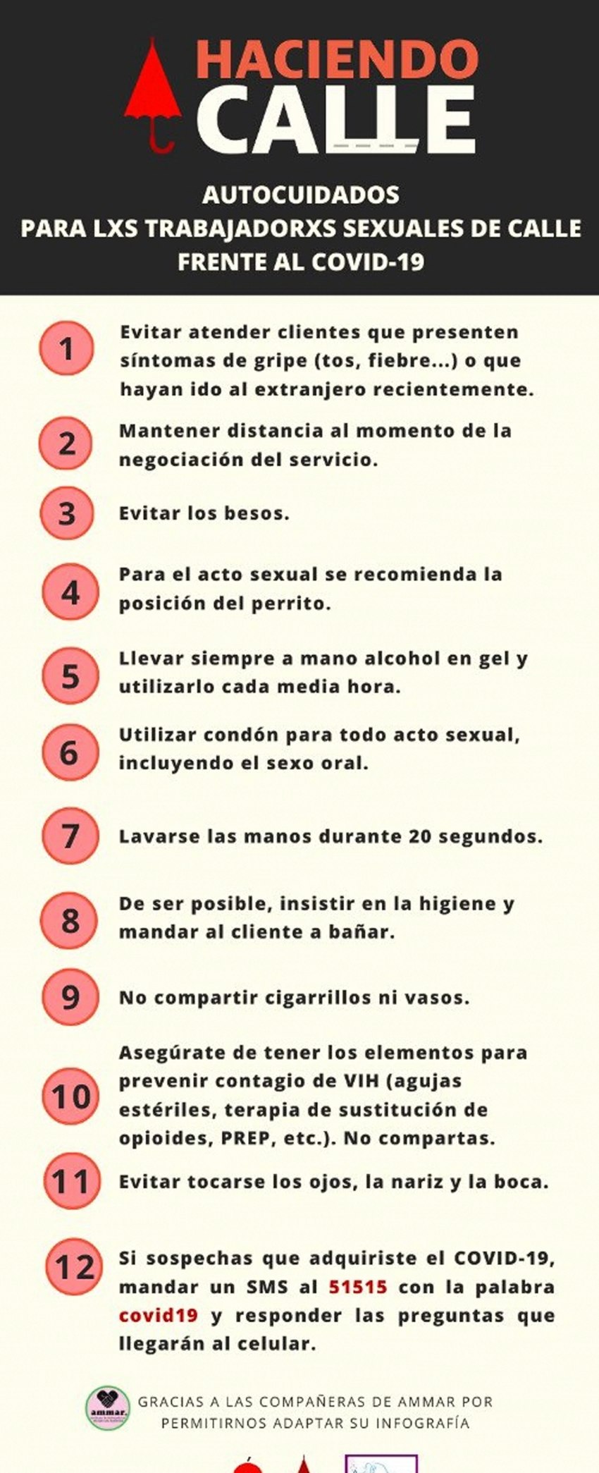 En esta lista de autocuidados se les pide a las trabajadoras sexuales evitar dar servicios a clientes con síntomas de gripe, como fiebre, dolor de cabeza, tos o que hayan visitado el extranjero recientemente, aunado a evitar compartir cigarrillos, vasos o algún otro objeto que tenga contacto con la saliva, sumado a no compartir elementos que pudieran ser portadores del VIH.