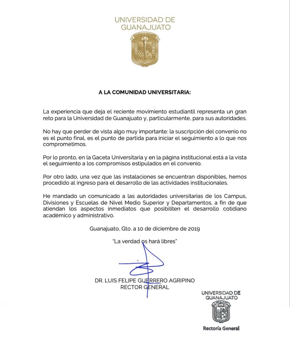 Al llegar a su despacho, el rector general de la UG, Luis Felipe Guerrero Agripino, dijo que en las instalaciones de Guanajuato Capital, Irapuato y Salamanca ya se había retirado el material y los campamentos, por lo que sólo restaba darle seguimiento a los puntos acordados en el convenio que signó junto al Gobernador, el Fiscal y el alcalde de Guanajuato.