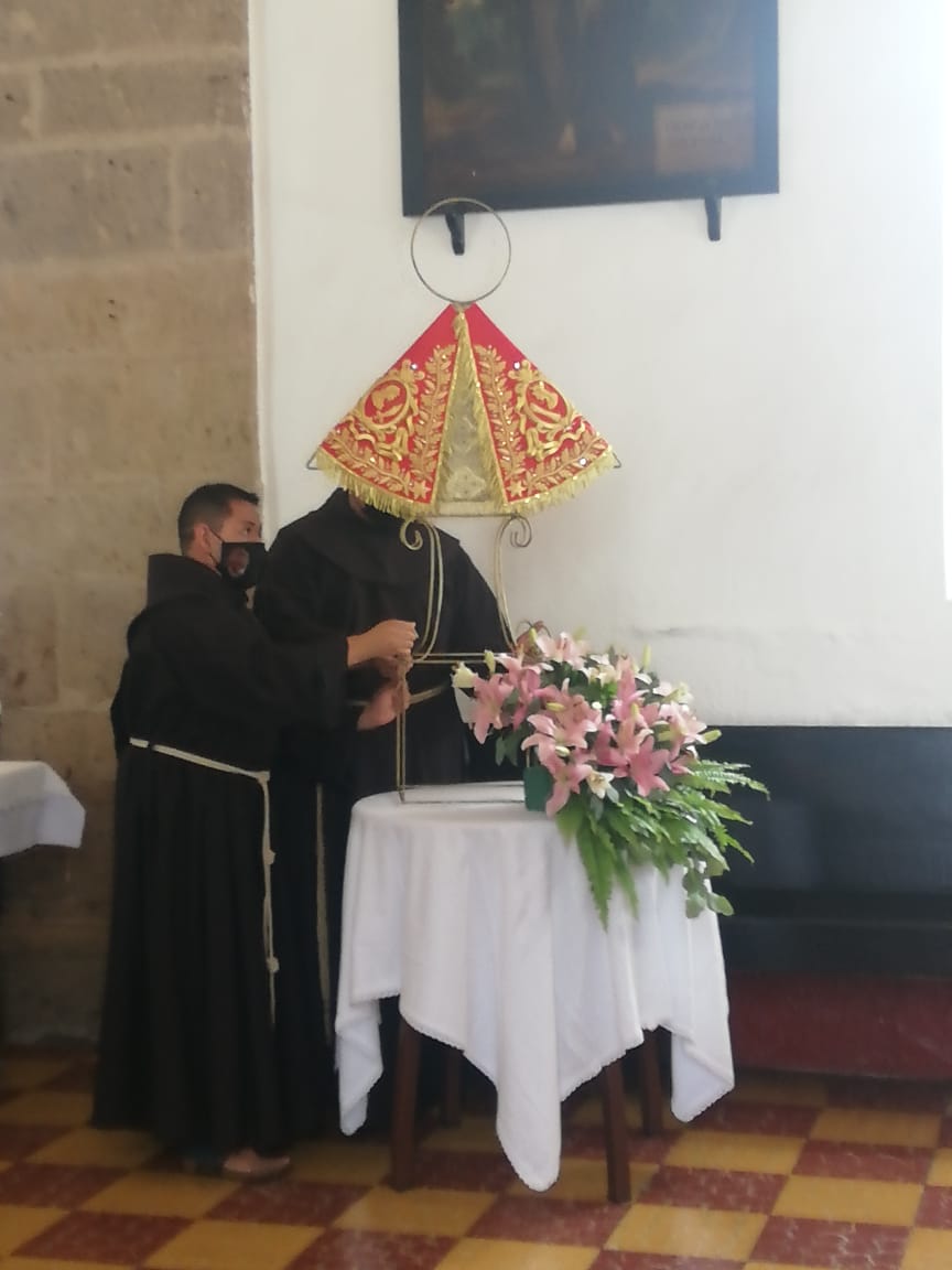 La vestimenta que utilizará la Virgen de Zapopan durante el festejo del bicentenario este 15 de septiembre y posteriormente en la Romería fue presentado en el Convento de la Basílica de Zapopan.