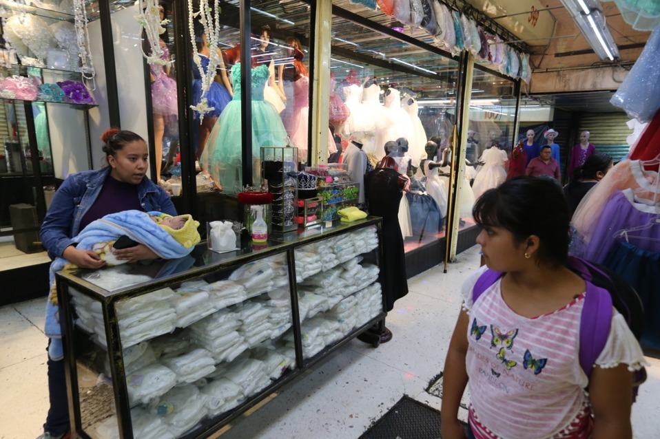 Paulina es vendedora. Desde hace seis años gana el cinco por ciento de comisión por cada vestido de quince años que logra venderse en el local 354 del mercado de la Lagunilla. Sus horarios se rigen por el horario en que el mercado abre y cierra, por lo que todas las tardes, sus hijos se entretienen entre holanes, forros y mucha tela.