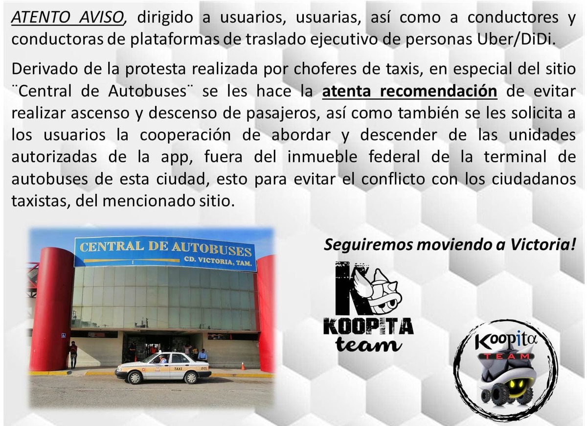 Usuarios de las plataformas digitales Uber y DiDi dejarán de dar servicio al interior de la Central de Autobuses de Ciudad Victoria, a raíz de las quejas emitidas por los concesionarios de taxis de la mencionada terminal de la capital de Tamaulipas, dieron a conocer a través de redes sociales este lunes.