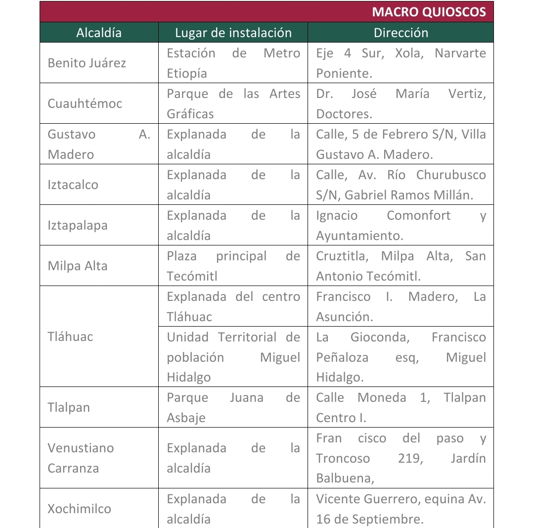 Para Gustavo A. Madero, Iztacalco, Iztapalapa, Venustiano Carranza y Xochimilco, en las explanadas de sus respectivas alcaldías.
