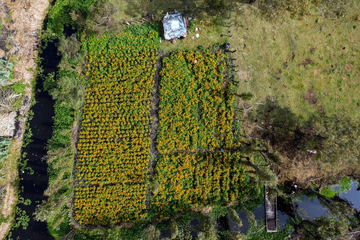 Solo algunas chinampas en el lago de Xochimilco lucen pintadas de naranja, el color de la flor de cempasúchil, tradicional del Día de Muertos en México. Ante el temor de ventas bajas por la pandemia de covid-19, los productores decidieron reducir su siembra.