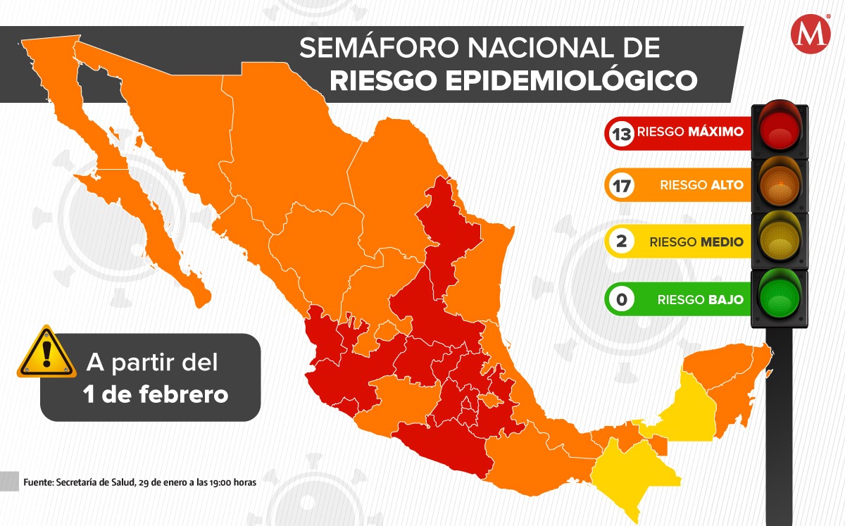 En el actual semáforo epidemiológico por coronavirus SARS-CoV-2, hay 13 estados en color rojo, 17 en naranja, dos en amarillo y ninguno está en verde.