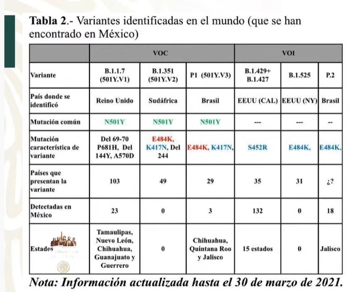 La mutación B.1.429 + B.1.427 se ha localizado en 15 estados. La P.2 en Jalisco con 18 casos.