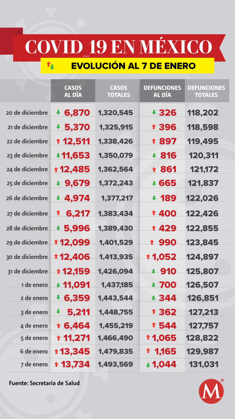 México suma 131 mil 031 muertes por covid-19 este jueves, de acuerdo con la información proporcionada por la Secretaría de Salud. El país ha alcanzado un millón 493 mil 569 casos por coronavirus SARS CoV-2.