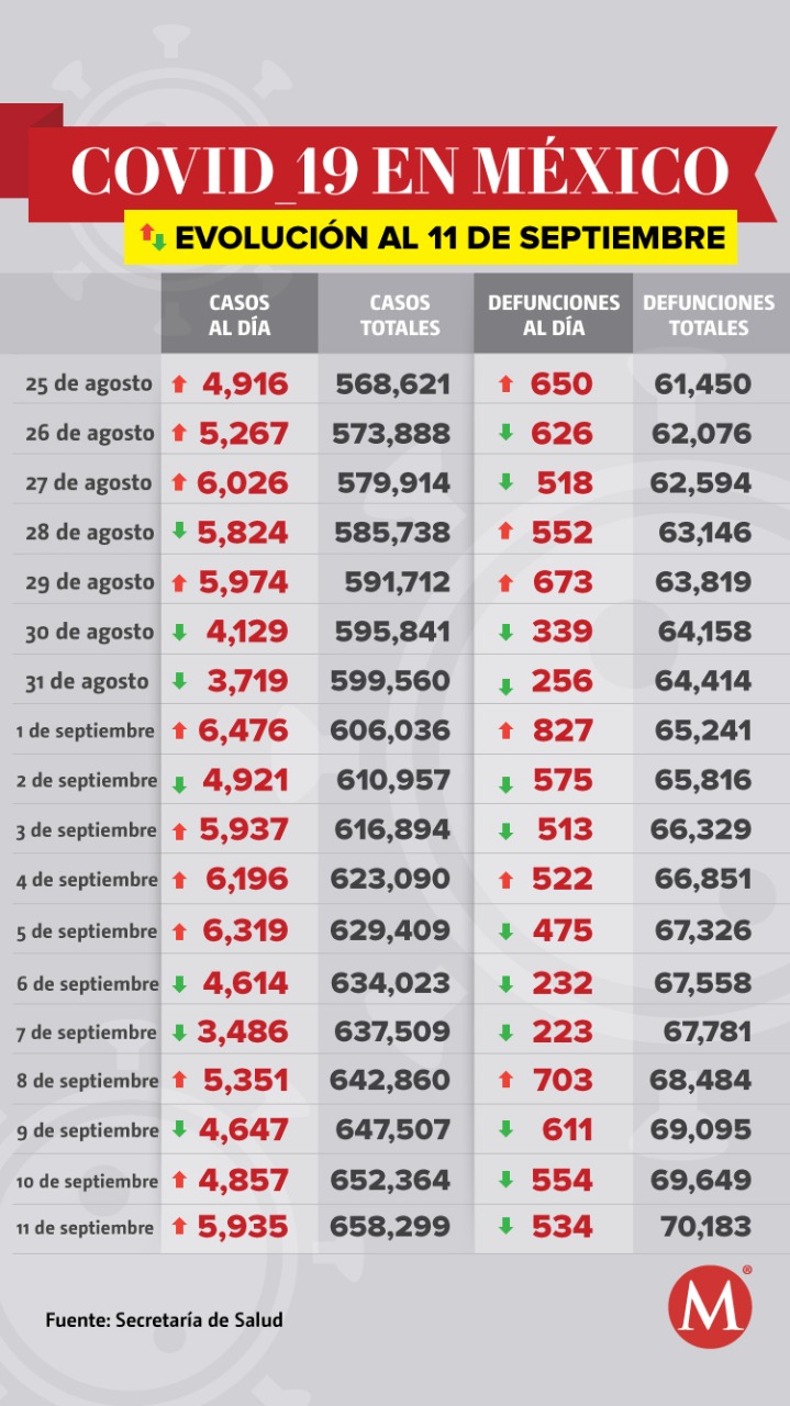 Hoy México alcanzó 70 mil 183 muertes por coronavirus SARS-CoV-2 y acumula 658 mil 299 confirmados, de los cuales 750 mil 813 son negativos; además registra 87 mil 210 casos sospechosos.