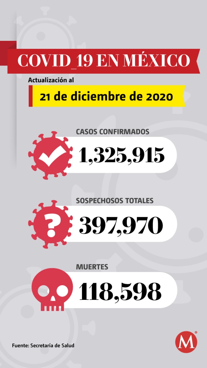 El día de hoy, México registró 118 mil 598 muertes por coronavirus SARS - CoV-2 y acumuló un millón 325 mil 915 casos confirmados, de los cuales 397 mil 970 son sospechosos, informaron autoridades de la Secretaría de Salud.