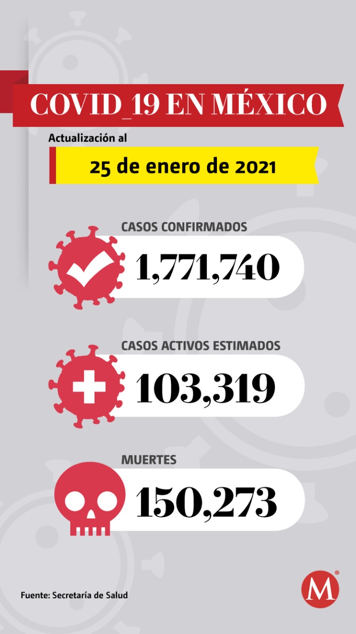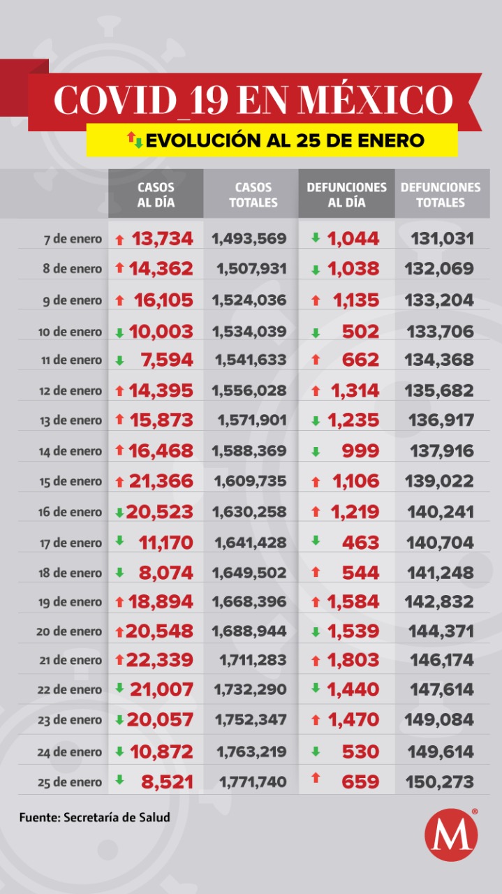México registra 659 muertes en un día por covid-19, para un total de 150 mil 273 fallecimientos, de acuerdo con información de la Secretaría de Salud; además, se registraron 8 mil 521 nuevos contagios en 24 horas, para un total de un millón 771 mil 740 casos confirmados.