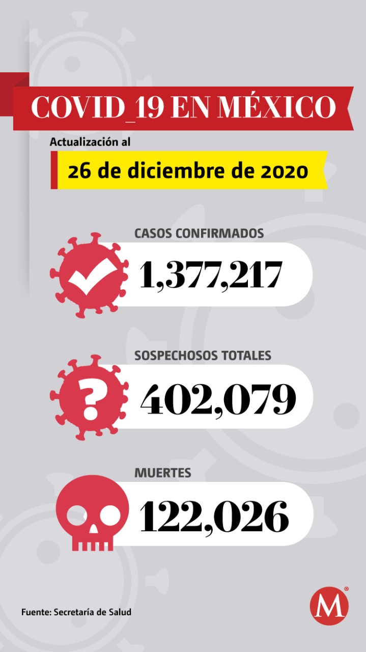 México registró 122 mil 26 muertes por coronavirus SARS CoV-2 y acumuló un millón 377 mil 217 casos confirmados, de los cuales 402 mil 079 son casos sospechosos, de acuerdo con información de la Secretaría de Salud.