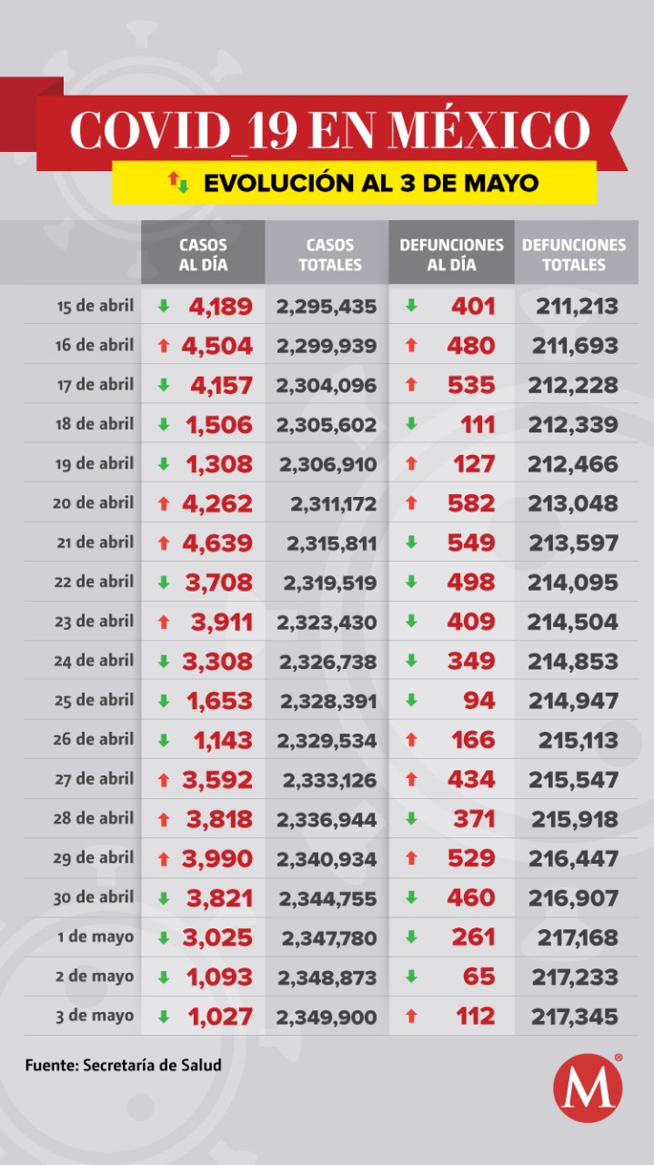 En México han muerto 217 mil 345 personas por coronavirus hasta este lunes, informó la Secretaría de Salud, que hoy reportó 112 defunciones por la enfermedad más que ayer.