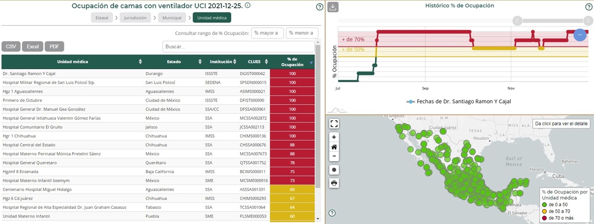 En México, 59 hospitales se encuentran con ocupación del 100 en camas generales por casos de covid-19, de acuerdo con datos del Sistema de Información de la Red IRAG, de la Secretaría de Salud del 25 de diciembre; mientras que en la ocupación de camas con ventilador UCI, hay 13 que también registran la máxima ocupación.