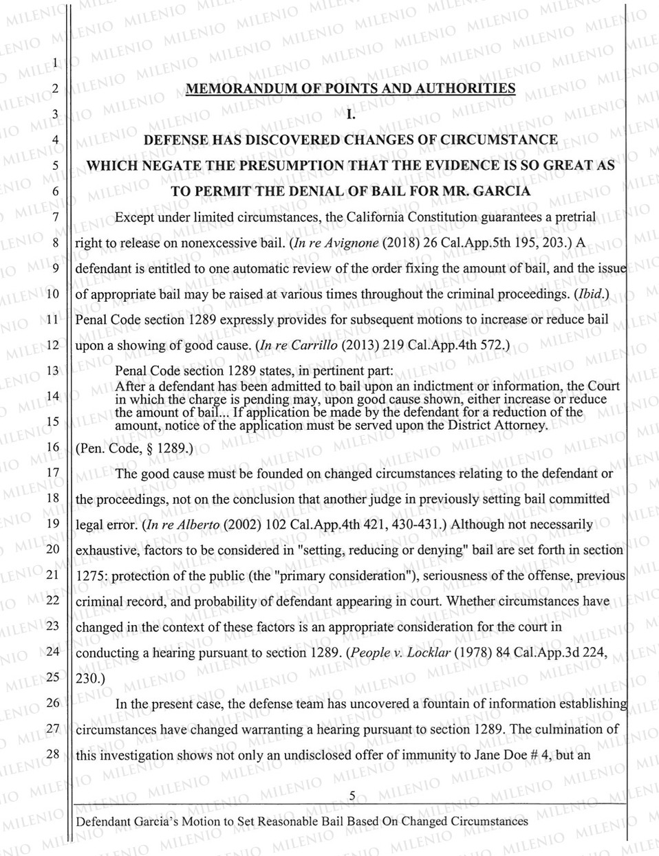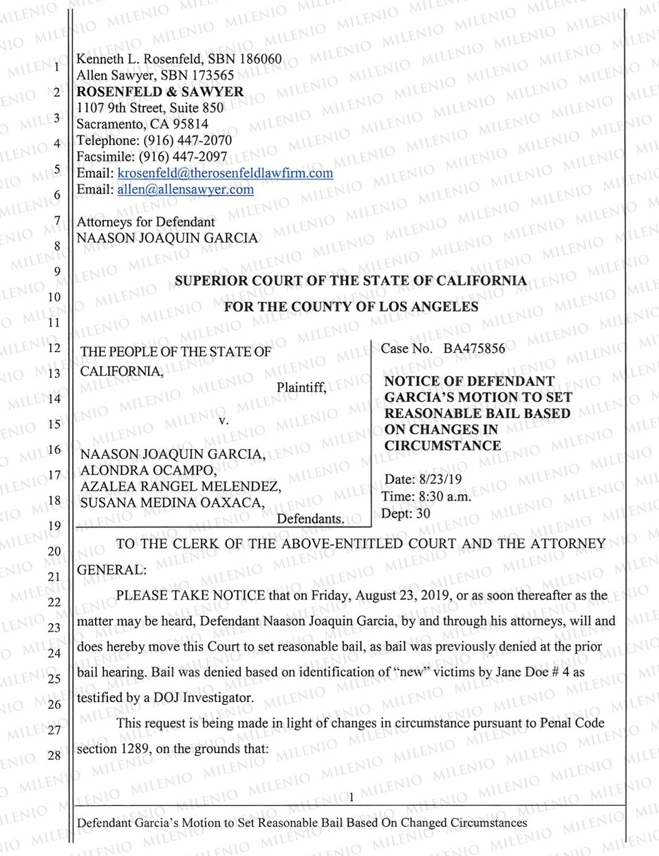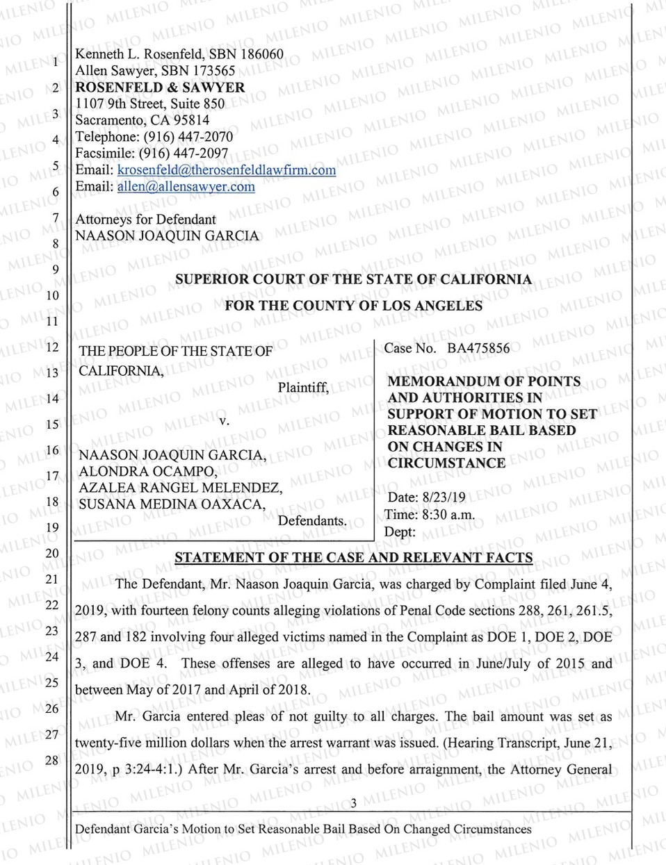 En el documento, la defensa expuso ante la Corte de California su versión en favor del acusado, argumentando que inicialmente se le impuso una fianza de 25 millones de dólares, después aumentó a 50, pero al final le negaron la posibilidad de salir aún pagando tal cantidad.