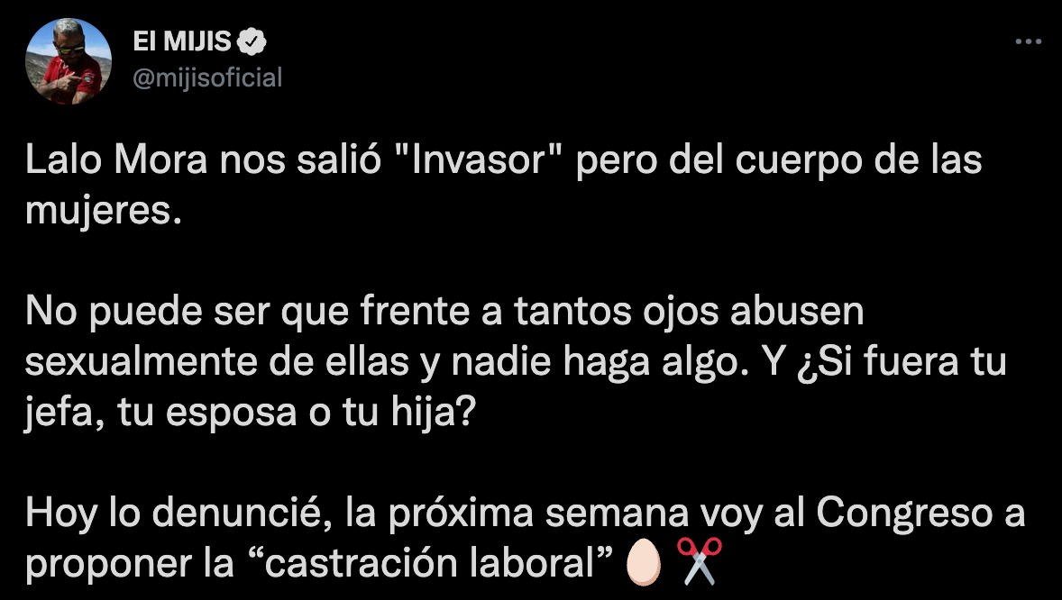 "Lalo Mora nos salió 'Invasor'¿ pero del cuerpo de las mujeres. No puede ser que frente a tantos ojos abusen sexualmente de ellas y nadie haga algo. Y ¿Si fuera tu jefa, tu esposa o tu hija? Hoy lo denuncié, la próxima semana voy al Congreso a proponer la castración laboral”.