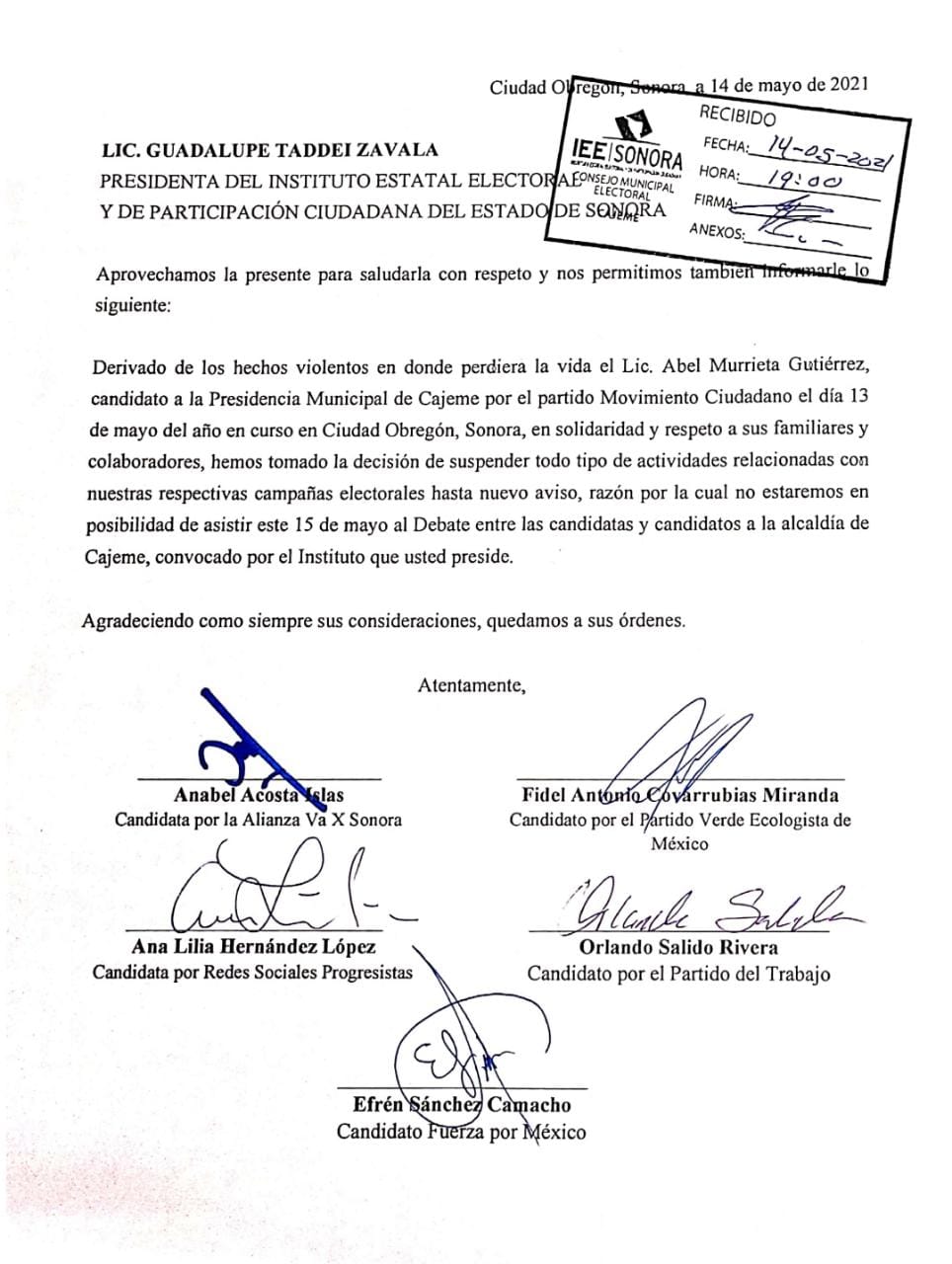 Por respeto y solidaridad con la familia y los colaboradores de Abel Murrieta Gutiérrez, los candidatos a la alcaldía de Cajeme decidieron no participar en el debate organizado por el Instituto Estatal Electora (IEE) que se tenía programado para este sábado 15 de mayo y en donde uno de los temas a abordar sería la seguridad pública.