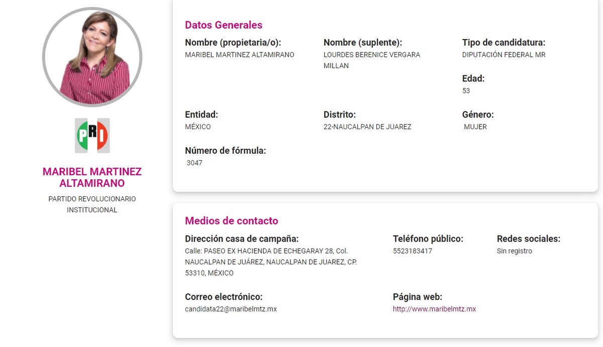 - Datos Generales como: el nombre, nombre (suplente), tipo de candidatura, edad, entidad, distrito, género y número de fórmula.