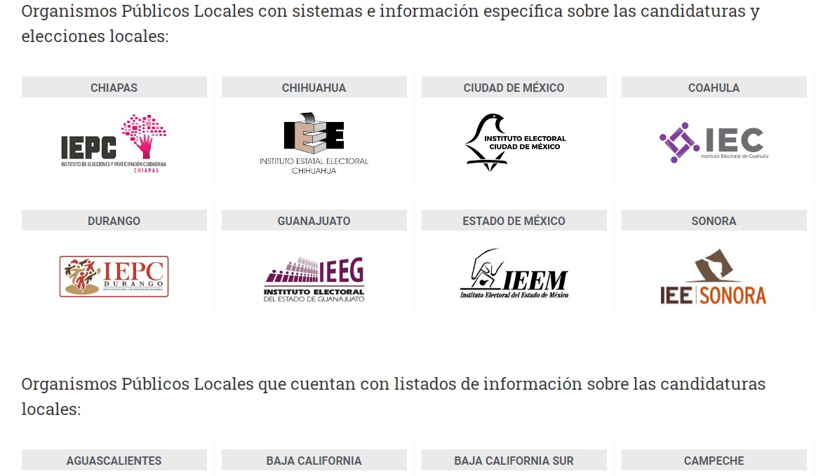 Al dar clic en ese apartado se desplegará un listado se los Organismo Públicos Electorales con sistemas e información específica sobre las candidaturas y elecciones locales, OPL que cuentan con listados de información sobre las candidaturas locales, y OPL que aún no cuentan con información.