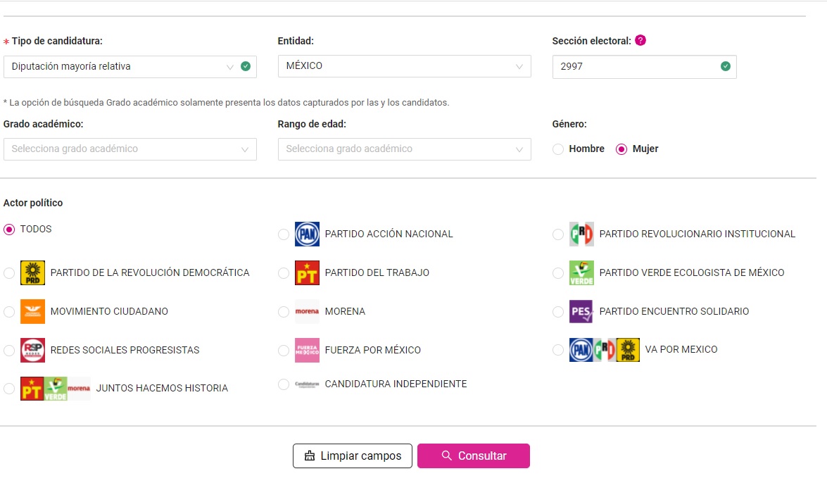 También se requiere ingresar el grado académico y rango de edad, pero es un requisito opcional, ya que solamente se presentan los datos capturados por las y los candidatos.