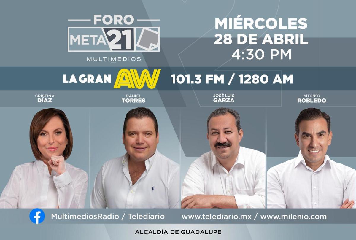 Los principales candidatos a la alcaldía de Guadalupe participarán este miércoles 28 de abril en el foro META21, que se transmitirá a través de las plataformas Multimedios Radio, Telediario y MILENIO.