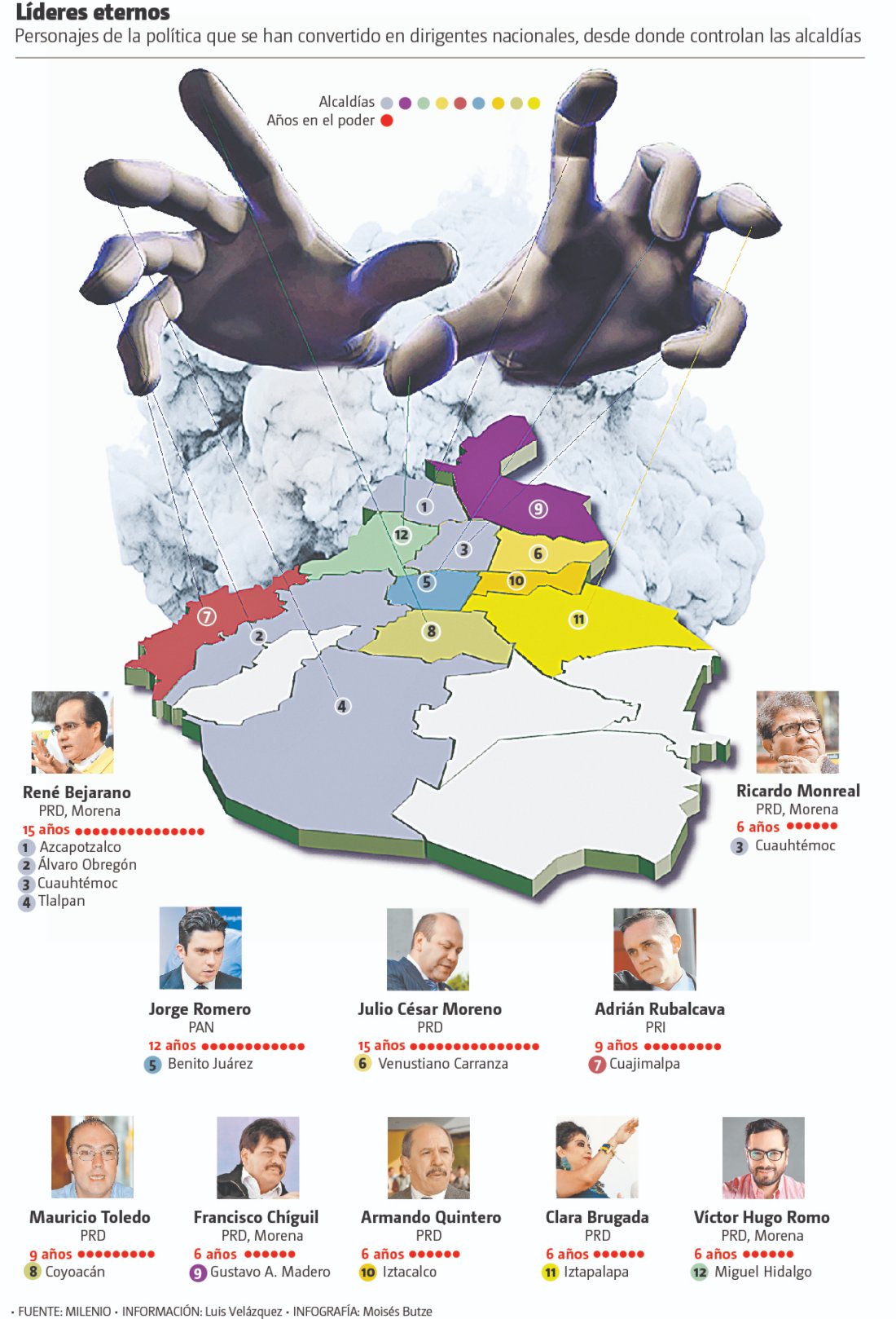 El caso más emblemático es el del alcalde en Venustiano Carranza, Julio César Moreno, quien ha mantenido bajo su mando la demarcación desde 2006 a la fecha y aspira a mantener el control en 2021, con lo que sumaría 18 años de dominio tras llegar al poder por el PRD y convertirse en líder territorial de Morena con el respaldo de la jefa de Gobierno de la Ciudad de México, Claudia Sheinbaum.