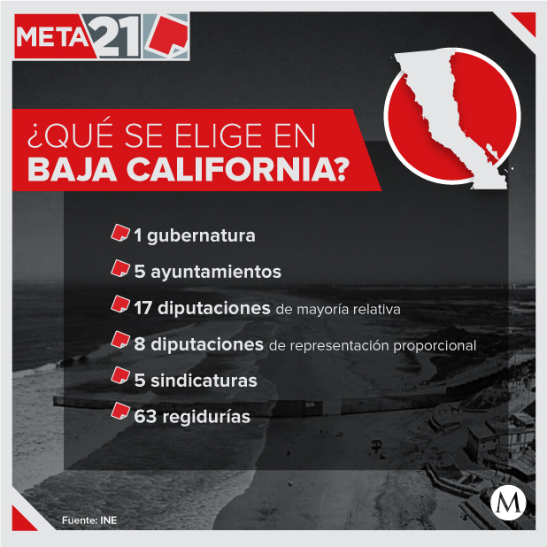 En el estado de Baja California se elegirá a un gobernador, 25 diputaciones (17 de mayoría relativa y ocho de representación proporcional), así como cinco presidencias municipales y alcaldías; cinco sindicaturas y 63 regidurías.