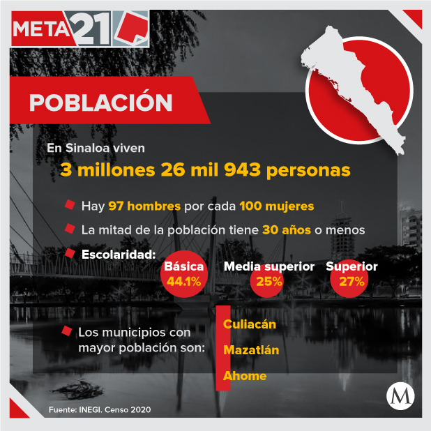 De acuerdo con el Censo del Instituto Nacional de Estadística y Geografía (Inegi) de 2020, en Sinaloa viven 3 millones 26 mil 943 personas, lo que representa 2.4 por ciento del total de la población del país.