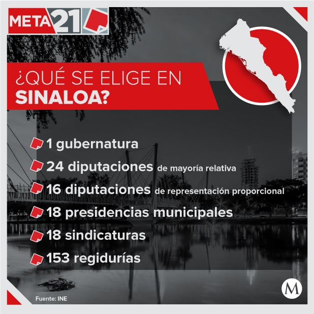 En Sinaloa se elegirá a un gobernador; 40 diputados (24 de mayoría relativa y 16 de representación proporcional), así como 18 presidentes municipales y sindicaturas; y 153 regidurías.