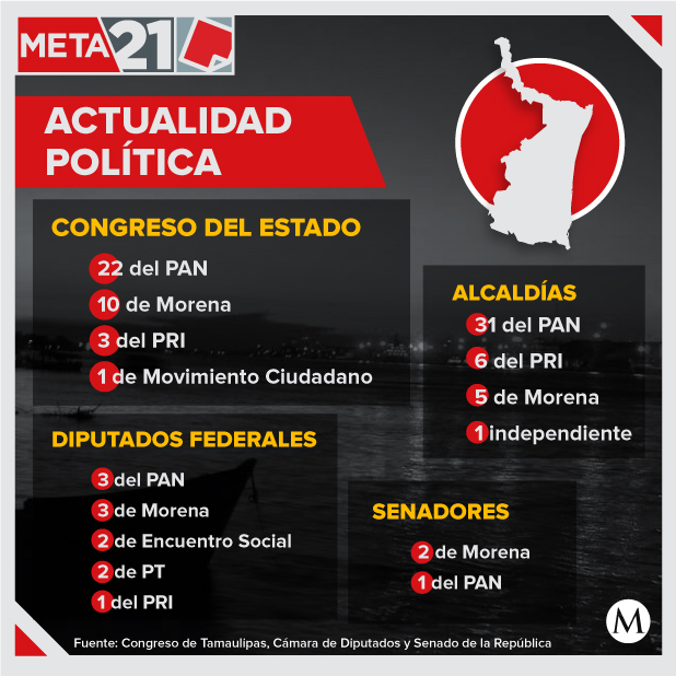 El Congreso de Tamaulipas, en su 64 legislatura, también está dominado por el Partido Acción Nacional (PAN), mientras que los diputados federales que representan al estado son mayormente de oposición, al igual que en el Senado.