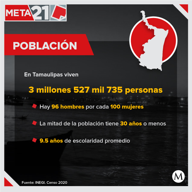 El Censo de Población y Vivienda 2020 del Inegi arrojó que en Tamaulipas viven 3 millones 527 mil 735 habitantes, lo que representa el 2.8 por ciento de la población nacional, así la entidad está en el lugar 14 a nivel nacional por el número de habitantes.