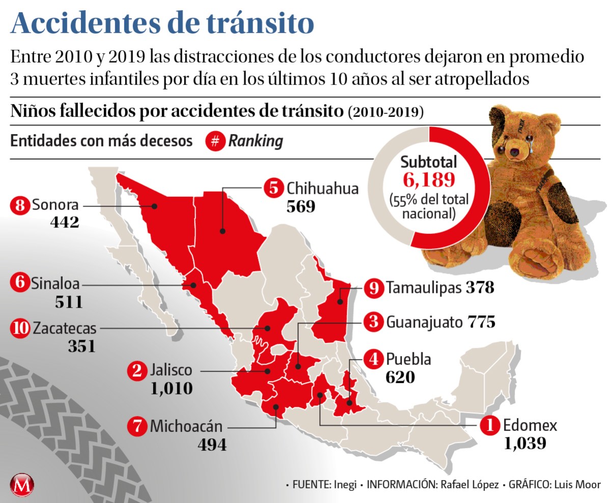 Cifras del Instituto Nacional de Estadística y Geografía (Inegi) revelan que entre 2010 y 2019 las distracciones de los conductores derivaron en un promedio de tres muertes infantiles por día en los últimos 10 años, una media similar a las 4.2 defunciones diarias que ocasionaron los tumores malignos en sus diferentes variables.