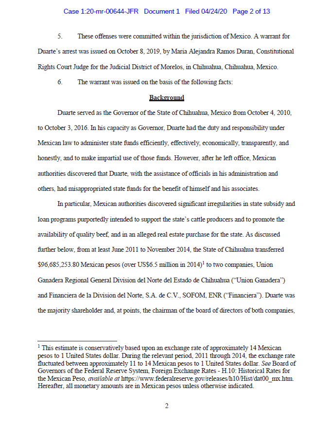 En la solicitud de extradición se detalla que las autoridades mexicanas “descubrieron irregularidades significativas en los programas estatales de subsidios y préstamos” para apoyar a ganaderos de Chihuahua y que un Análisis Financiero de Expertos “rastreó el dinero en cuentas bancarias, propiedades y compañías relacionadas con Duarte o sus asociados”.
