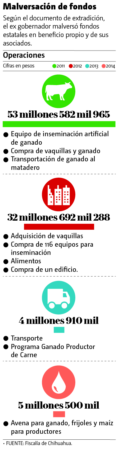 De acuerdo con la solicitud de extradición del gobierno mexicano, en poder de MILENIO, el ex priista es acusado de peculado y delincuencia organizada, por el desvío de 96 millones 685 mil 253 pesos, para favorecer a sus empresas en la adquisición de vaquillas, equipo de inseminación artificial, transporte y avena para su ganado y la compra frijol y maíz para sus productores.