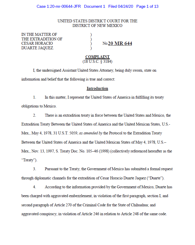 Tres semanas después de ubicarlo en Nuevo México en marzo, las autoridades mexicanas solicitaron a Estados Unidos la extradición de César Duarte para ser juzgado por un quebranto de 96 millones de pesos a la Hacienda estatal y no por la llamada Operación Zafiro, que denunció el actual mandatario Javier Corral y que consistió en la supuesta utilización de recursos públicos en las campañas del PRI en 2015, por lo que no enfrentará por ahora esa imputación.