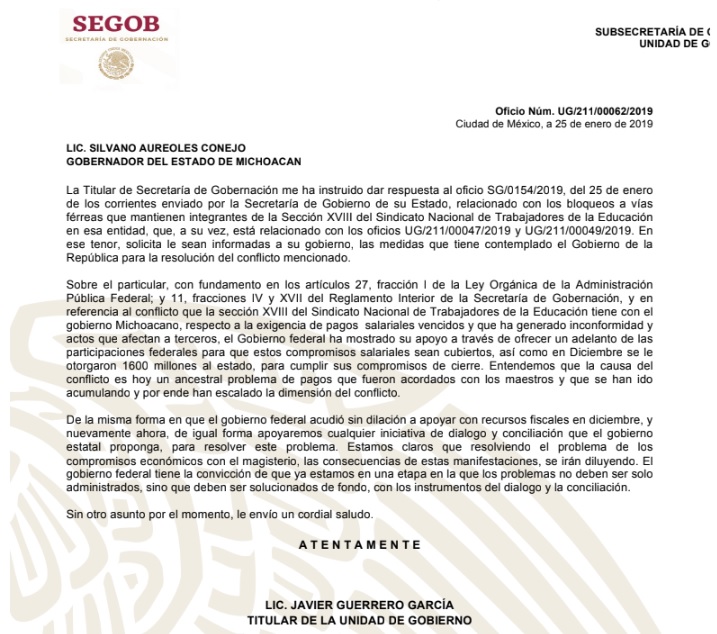 “Estamos claros que resolviendo el problema de los compromisos económicos con el magisterio, las consecuencias de estas manifestaciones, seguirán diluyendo. El gobierno federal tiene la convicción de que ya estamos en una etapa en la que los problemas no deben ser sólo administrativos sino que deben ser solucionados de fondo, con los instrumentos del diálogo y la conciliación”, destacó en un oficio enviado al mandatario michoacano.