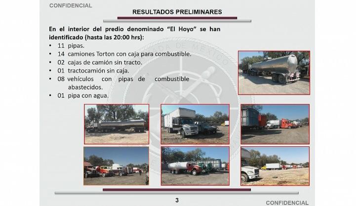 Reiteró que en la zona se decomisaron 11 pipas, 14 camiones torton con caja para combustible, dos cajas de camión sin caja, ocho vehículos con pipas de gasolina abastecidos y una pipa con agua.