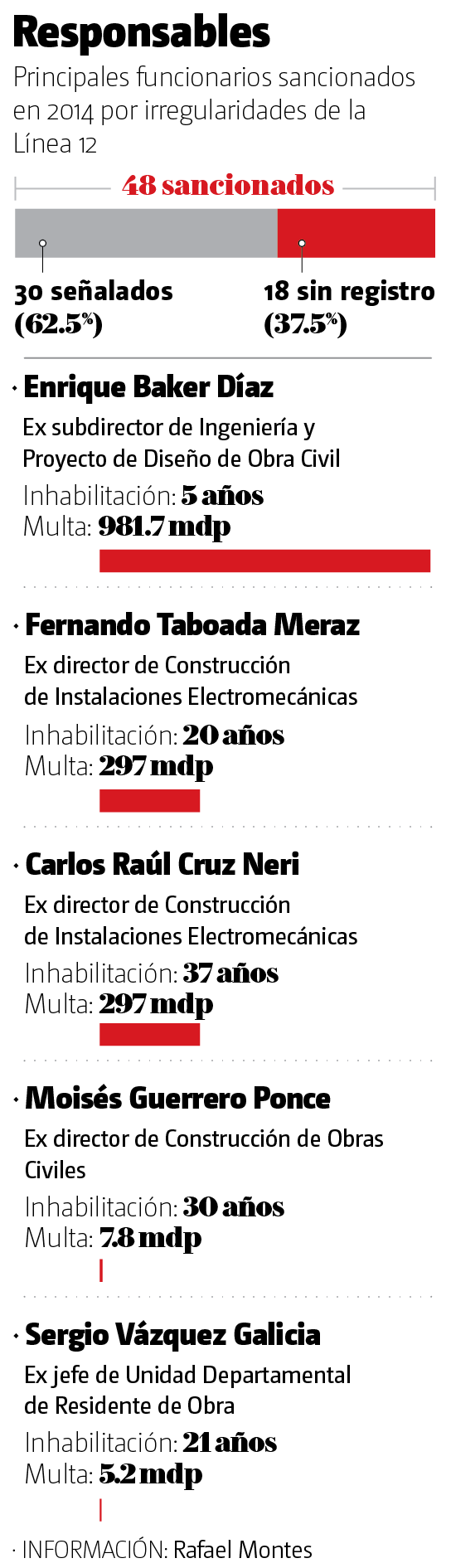 Por ejemplo, Moisés Guerrero Ponce, ex director de Construcción de Obras Civiles de Proyecto Metro, acumula dos destituciones, una multa por 7.8 millones de pesos y cuatro inhabilitaciones, dos de 15 años, una de 10 y otra de cinco.
