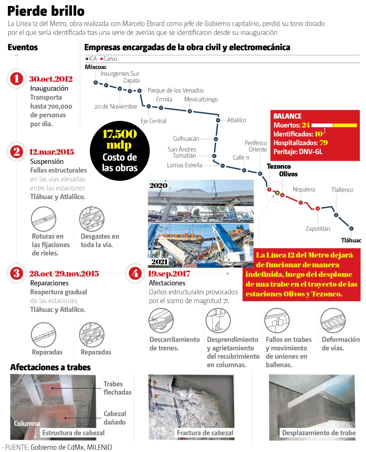 En tanto, hace tres años el tramo Olivos-Tezonco sufrió fuertes daños por el sismo de 2017 y en 2018 se señalaron graves fallas estructurales que requirieron trabajos de rehabilitación en distintos puntos, como resanar trabes y columnas a escasos metros del lugar del incidente.