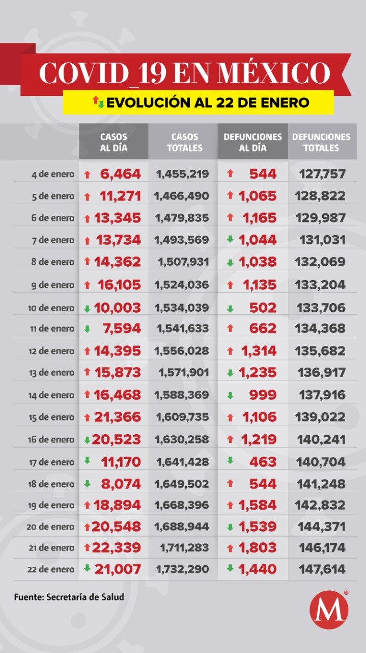 México registró mil 440 nuevas muertes y 21 mil 7 nuevos casos de covid-19 este viernes, de acuerdo con el reporte de la Secretaría de Salud que dio a conocer las cifras de la pandemia en el país al 22 de enero.
