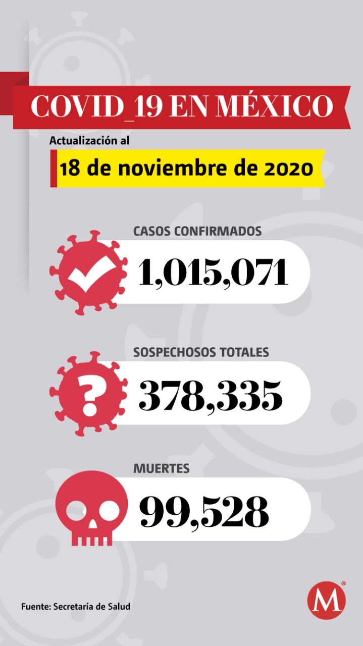 Hoy México alcanzó 99 mil 528 muertes por coronavirus SARS-CoV-2 y acumula un millón 15 mil 71 casos confirmados, de los cuales un millón 239 mil 269 son negativos; además se tienen 378 mil 335 casos sospechosos, informó José Luis Alomía, director general de Epidemiología.