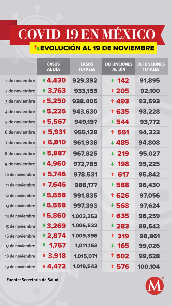 México superó las 100 mil muertes por covid-19 este jueves, de acuerdo con el reporte de la Secretaría de Salud que dio a conocer las cifras de la pandemia en el país al 19 de noviembre.
