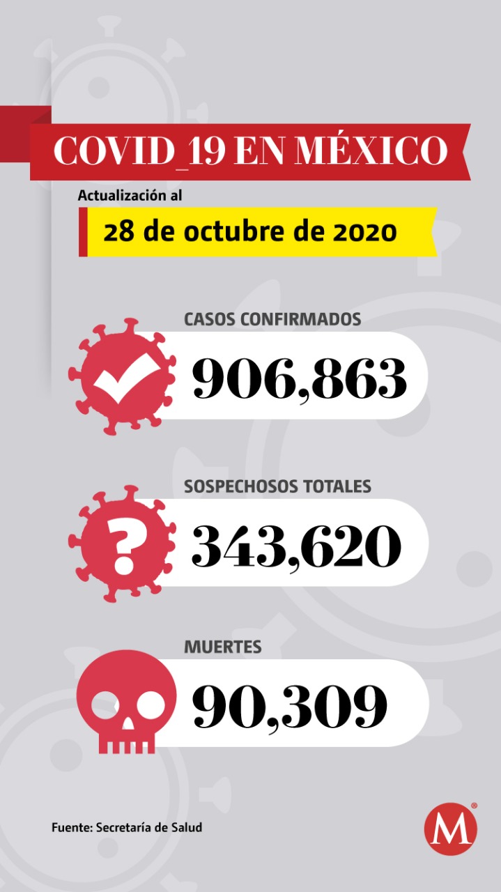 Al 28 de octubre México registra 90 mil 309 muertes por coronavirus SARS-CoV-2 y acumula 906 mil 863 casos confirmados, así como 343 mil 620 casos sospechosos, informaron autoridades de la Secretaría de Salud.