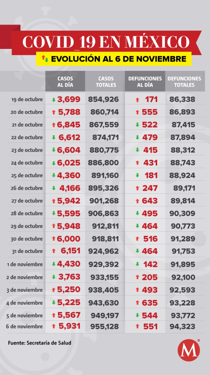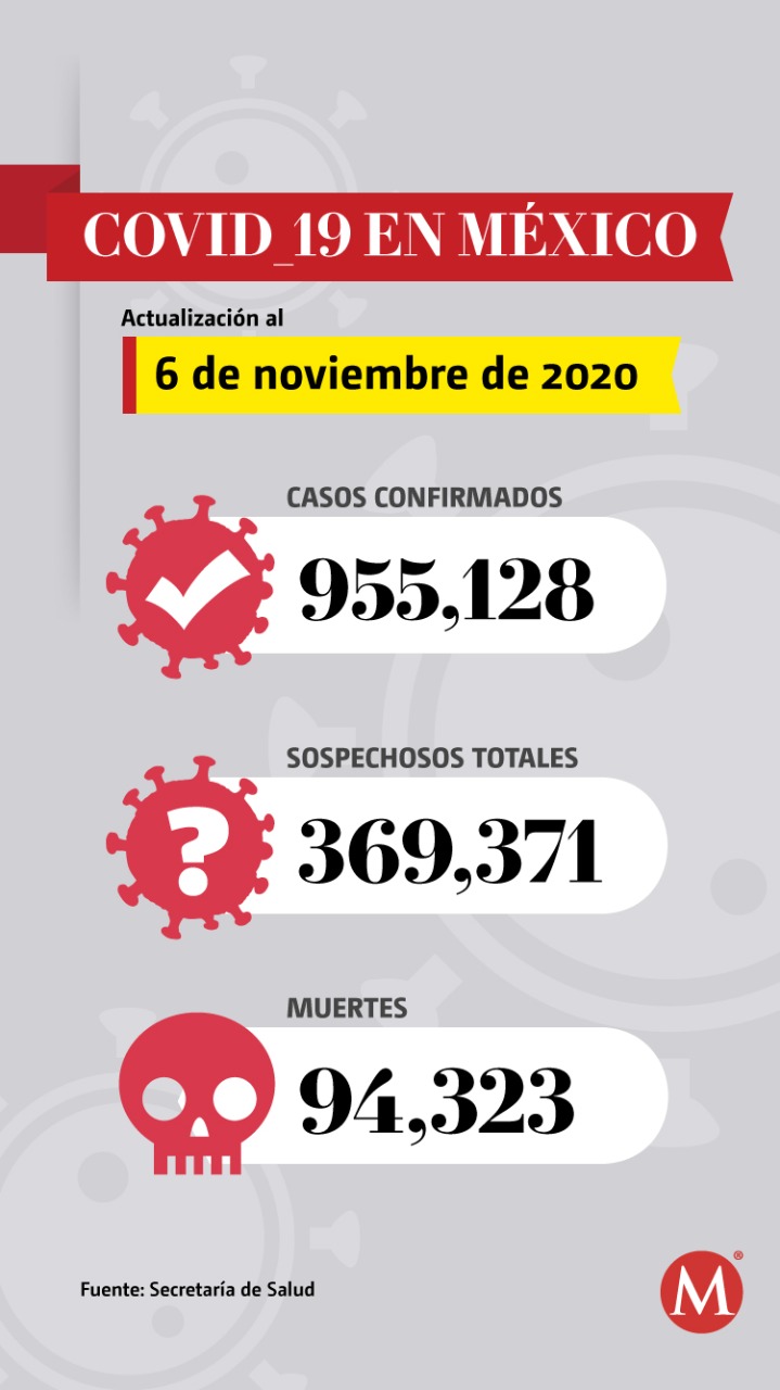 México alcanzó 94 mil 323 muertes por coronavirus SARS-CoV-2 y acumula 955 mil 128 casos confirmados, de los cuales un millón 160 mil 644 son negativos; además se tienen 369 mil 371 casos sospechosos, informó José Luis Alomía, director general de Epidemiología.