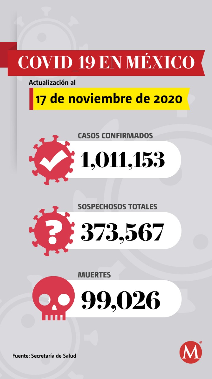 Hoy México alcanzó 99 mil 26 muertes por coronavirus SARS-CoV-2 y acumula un millón 11 mil 153 casos confirmados, de los cuales un millón 233 mil 643 son negativos; además se tienen 373 mil 567 casos sospechosos, informó José Luis Alomía, director general de Epidemiología.