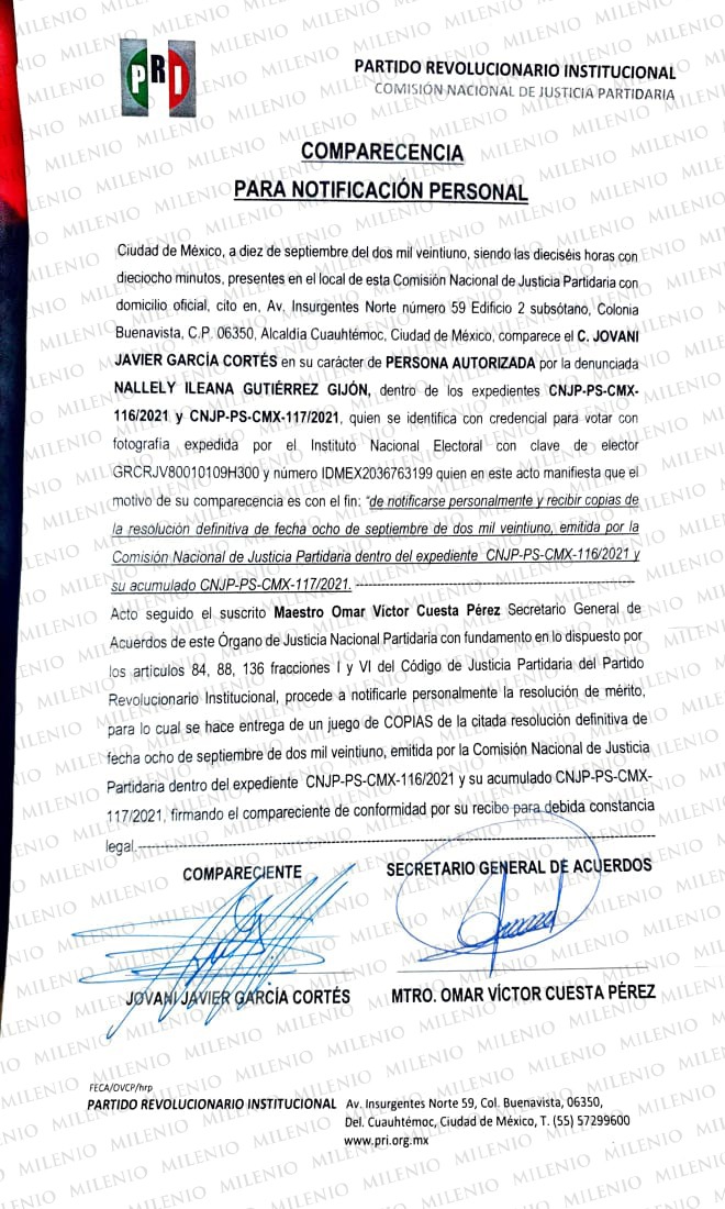 El pleno de la Comisión de Justicia Partidaria del Partido Revolucionario Institucional (PRI) afirmó que notificó a Nallely Ileana Gutiérrez Gijón y a Ulises Ernesto Ruiz Ortiz la resolución adoptada por unanimidad en el que se determinó la expulsión de ambos del partido.