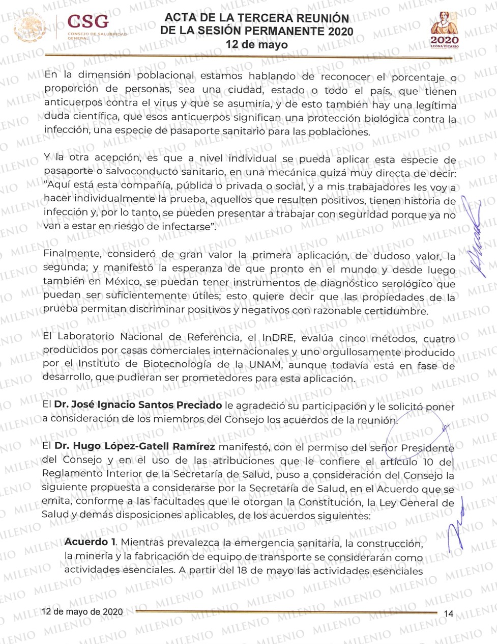En la reunión se aprobó un acuerdo compuesto por cuatro puntos en los que se enlistó los sectores económicos que serían considerados esenciales y la implementación de un sistema de semáforo, decisión que se basó primero en una gráfica presentada por la Secretaría de Economía en la que se proyectaba una curva epidémica muy distinta a lo que realmente ocurrió, se admitió en varias ocasiones que la decisión de reanudar actividades significaba un riesgo.