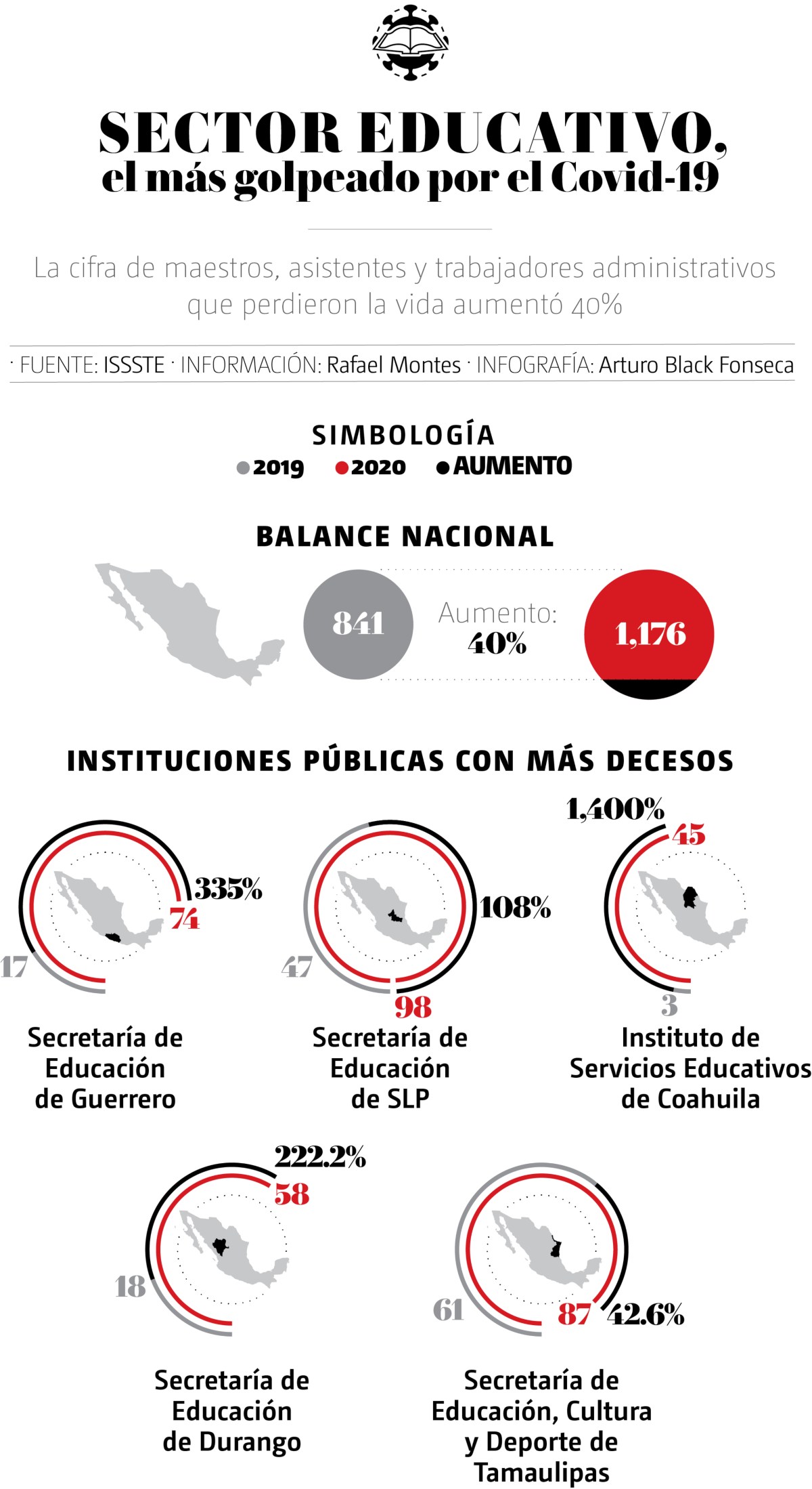 A nivel general, las muertes de servidores públicos aumentaron 47 por ciento entre 2019 y 2020, según los datos del ISSSTE, pero fue en decenas de oficinas del sector educativo donde se registraron los picos más altos.