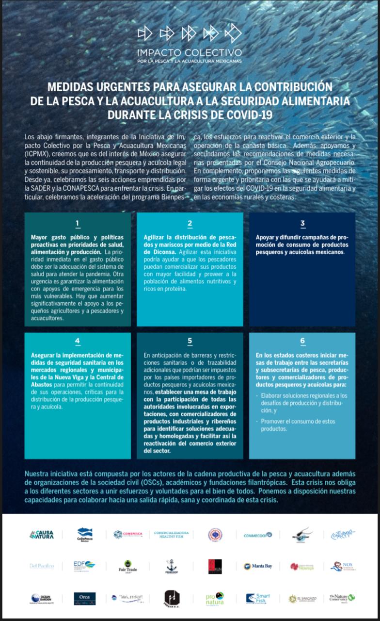 Asimismo, propuso seis medidas que consideró urgentes para evitar mayores afectaciones al sector pesquero y acuícola, entre las que se encuentra: generar un mayor gasto público y políticas proactivas en prioridades de salud, alimentación y producción; crear apoyos de emergencia para los más vulnerables y brindar mayores beneficios a los pequeños agricultores, pescadores y acuacultores.