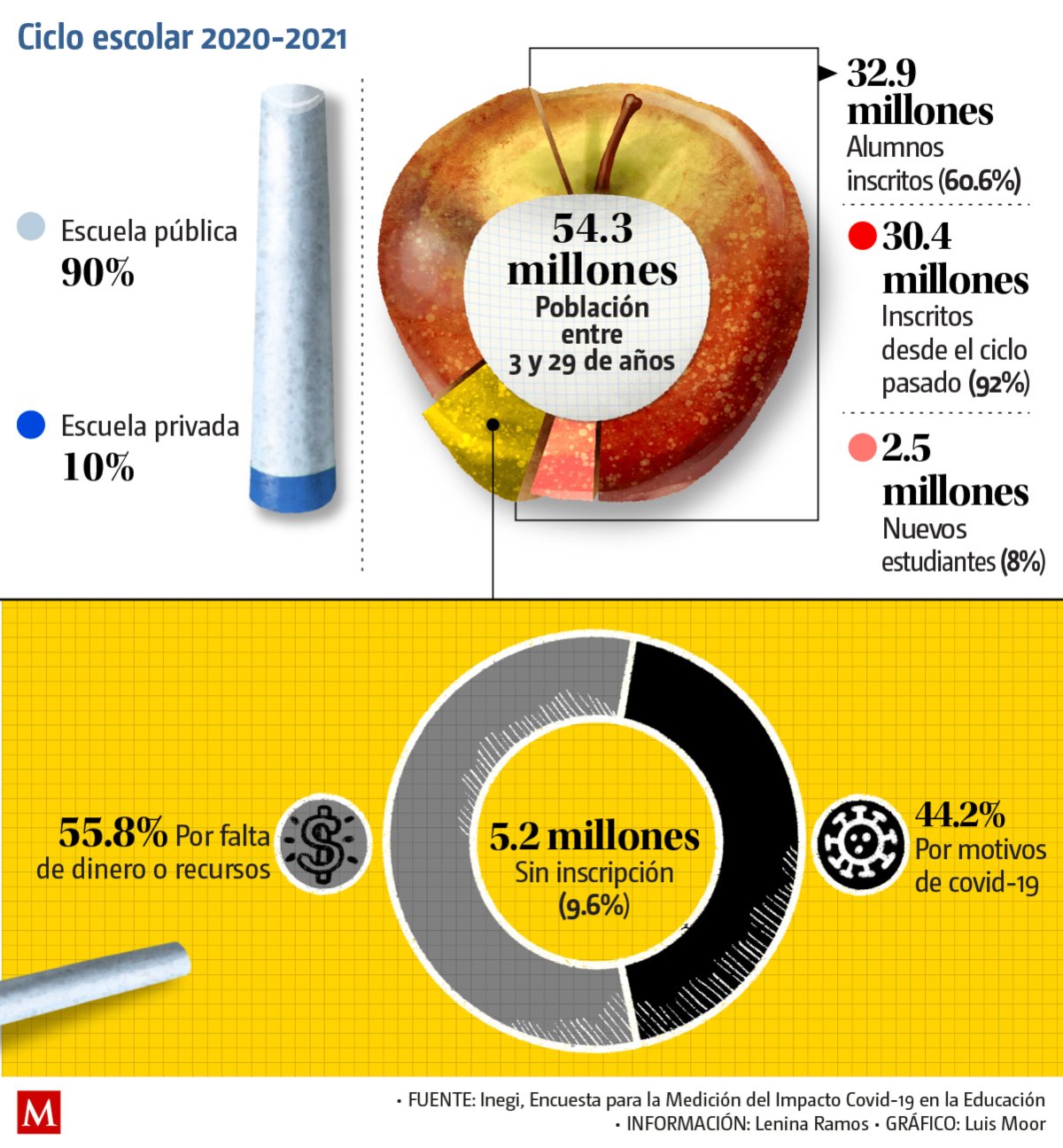 De acuerdo con un estudio del Instituto Mexicano para la Competitividad (IMCO), alrededor de 10 millones de estudiantes en el país tendrán un retraso de hasta dos grados escolares, por el cierre de escuelas a causa de la pandemia, mientras que la titular de la Secretaría de Educación Pública, Delfina Gómez, ha declarado que en el pasado ciclo escolar no hubo reprobados pues “la retención no nos llevaría más que a una alta probabilidad de abandono escolar, sería un terrible desincentivo”.