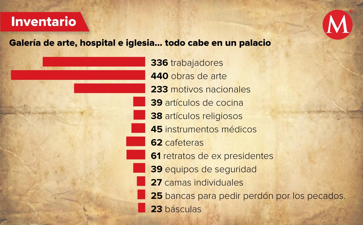 De acuerdo con el inventario de Presidencia 2021, el mandatario nacional y sus 336 trabajadores conviven con 24 mil 58 bienes registrados, entre los que destacan cientos de objetos religiosos que bien podrían servir para montar una catedral. El vasto instrumental médico incluye un tomógrafo de cuerpo completo, una cama clínica eléctrica de tres posiciones con barandales para adulto y un carro para tomar muestras sanguíneas. Todo un minihospital.