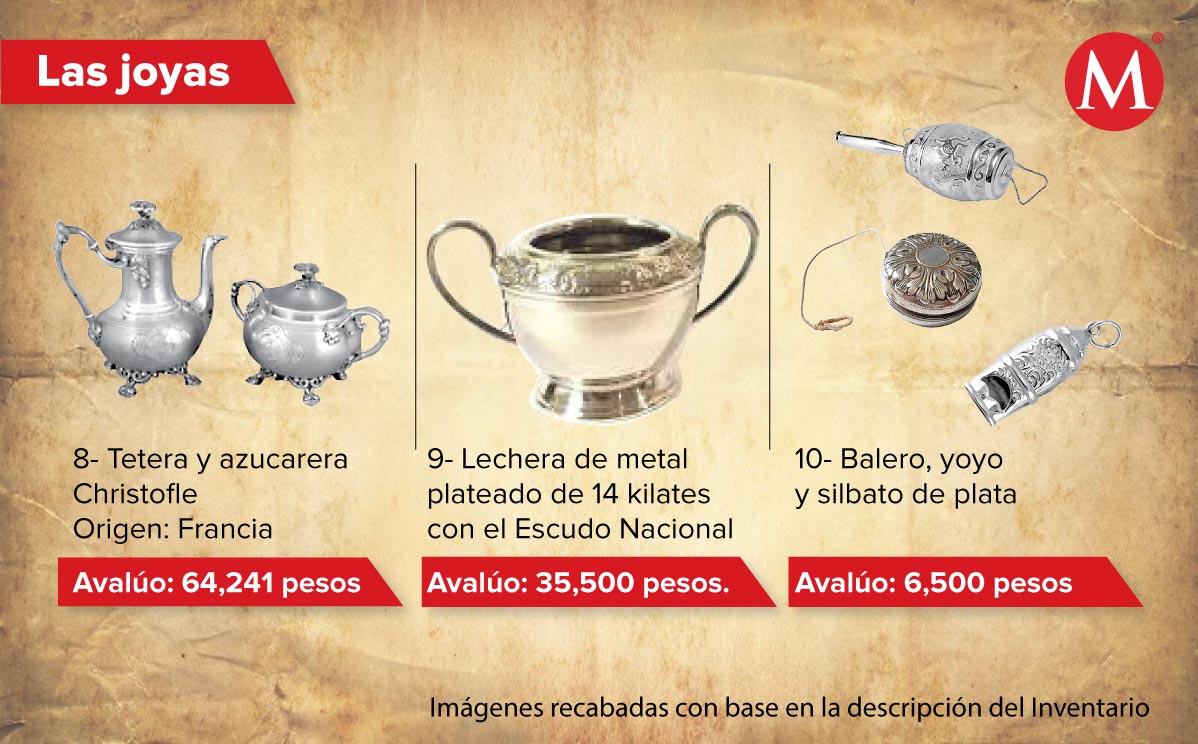 A estos artículos se suman otros con plata como un botanero (mil 565 pesos), calabaza (9 mil pesos), champañera (3 mil pesos), enfriador de vino (66 mil 455 pesos), ensaladera (11 mil 76 pesos), especiero (18 mil 175 pesos), frutero (35 mil 443 pesos), hielera (16, 614 pesos), platón (14 mil 399 pesos), salseras (16 mil 614) y soperas (33 mil 228 pesos).